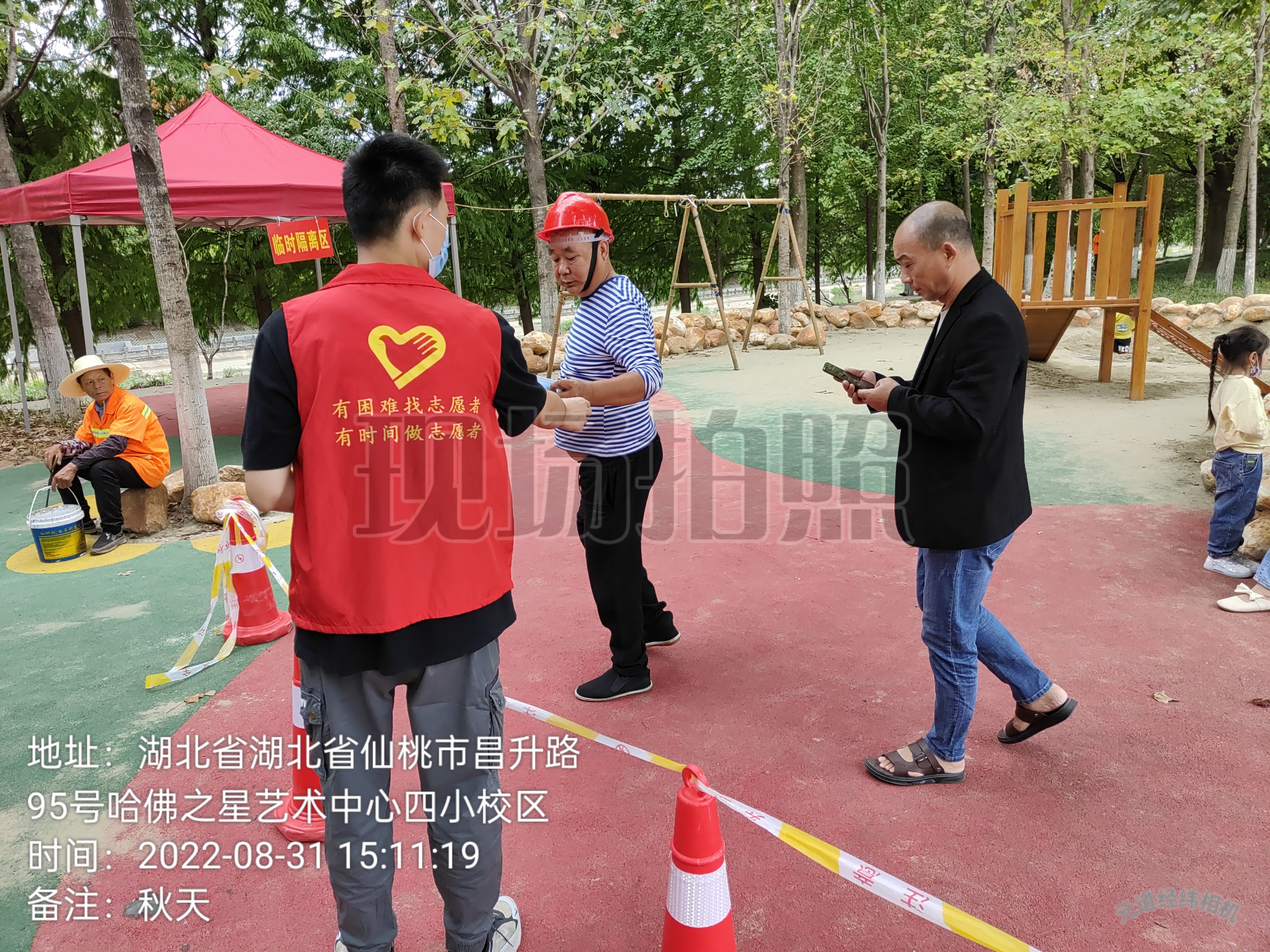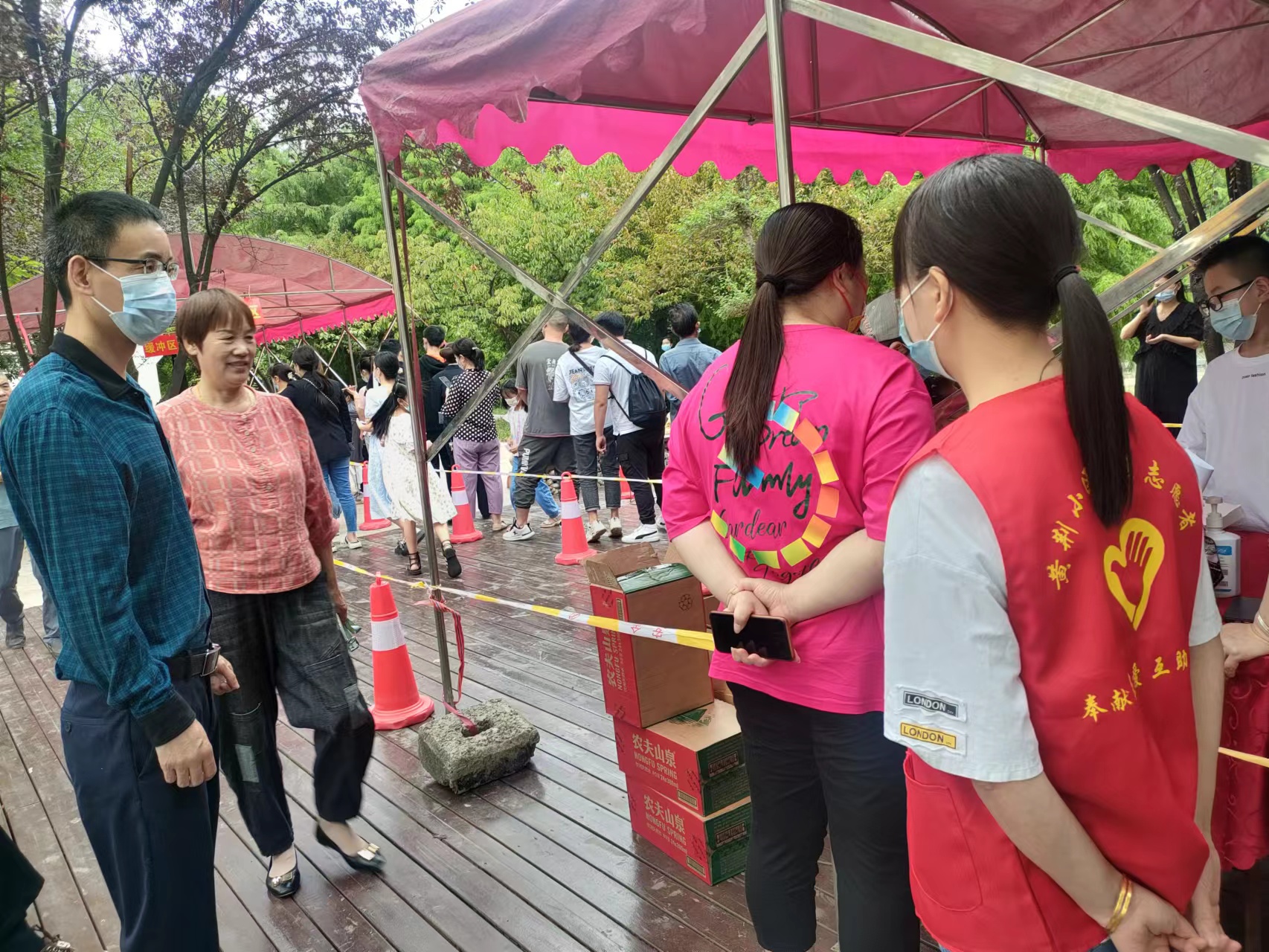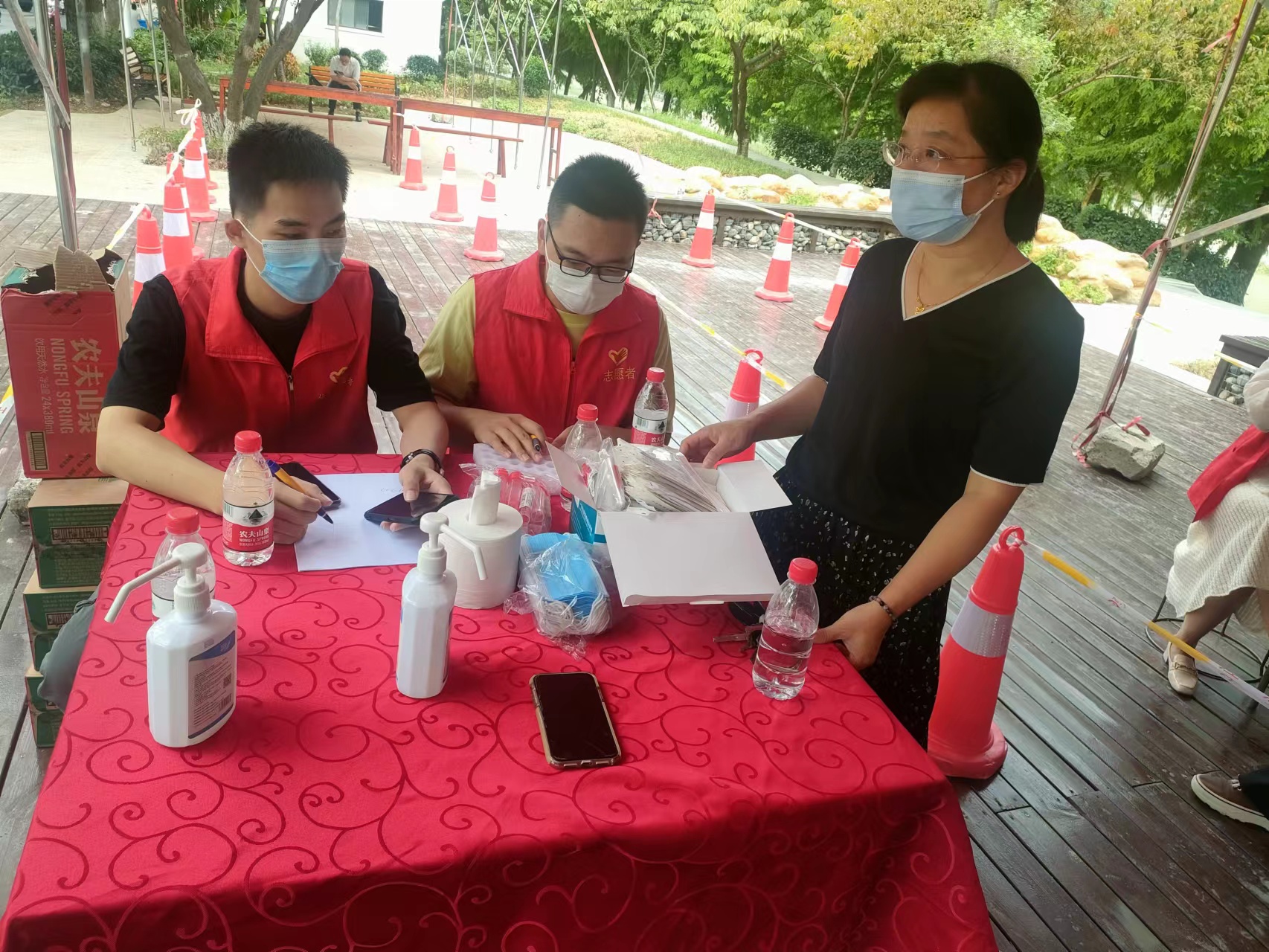 “每一个来检测的人都要注意让她们戴好口罩。”“这个试管是20人为一组,记得及时更换。”……市残联领导干部认真传达着注意事项,而我们的干部职工也成为了一个个忙碌的“红马甲”,认真做好检测登记、宣传引导、维持秩序等志愿服务工作,确保每个环节都严谨规范、有条不紊。“大姐,您拿出手机,我来一步一步教你如何操作。”“搞定了,现在已经登记上了。”为保证现场老年人也能顺利完成检测,市残联干部职工手把手教步骤、心贴心传真情,用实际行动当好人民健康的“守门人”,以殷殷真情筑牢防疫安全的“生命线”。 图为市残联干部职工在检测现场分发口罩